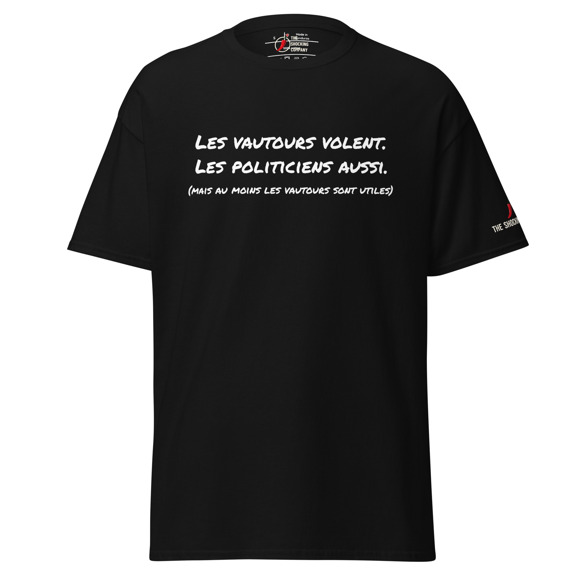 Exposez l’hypocrisie de la classe politique avec ce T-shirt satirique et engagé, conçu pour celles et ceux qui en ont assez des scandales, de la corruption et des milliards d’euros qui disparaissent mystérieusement chaque année. Son message percutant — « Les Vautours volent. Les Politiciens aussi. Mais au moins les Vautours sont utiles. » — frappe là où ça fait mal, avec un humour noir redoutable et une précision chirurgicale.